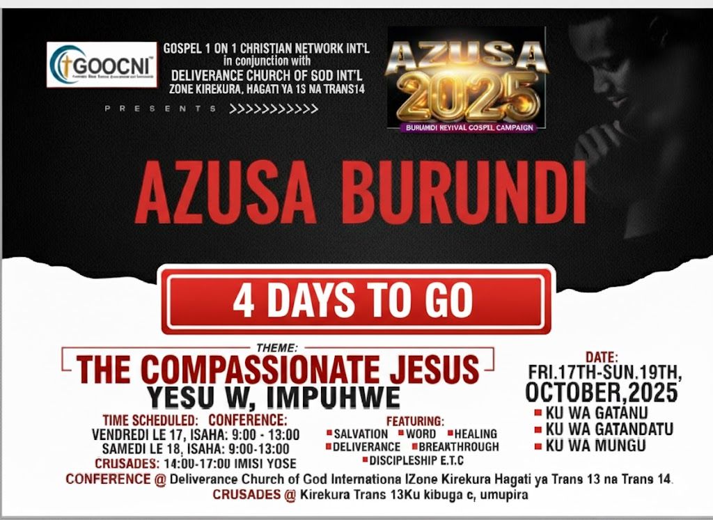 The countdown has begun! In just 4 days, the heavens will touch the earth as Burundi encounters a divine visitation. The Azusa fire is spreading once again — hearts are being stirred, prayers are rising, and the sound of revival is echoing across nations.This is not just another program; it’s a divine appointment with destiny. The Compassionate Jesus is ready to pour out His mercy, His love, and His power like never before. Miracles will break out, chains will be shattered, and lives will be transformed by His presence. Burundi, get ready — the fire is coming! Heaven is aligning, angels are moving, and the remnant is awakening.